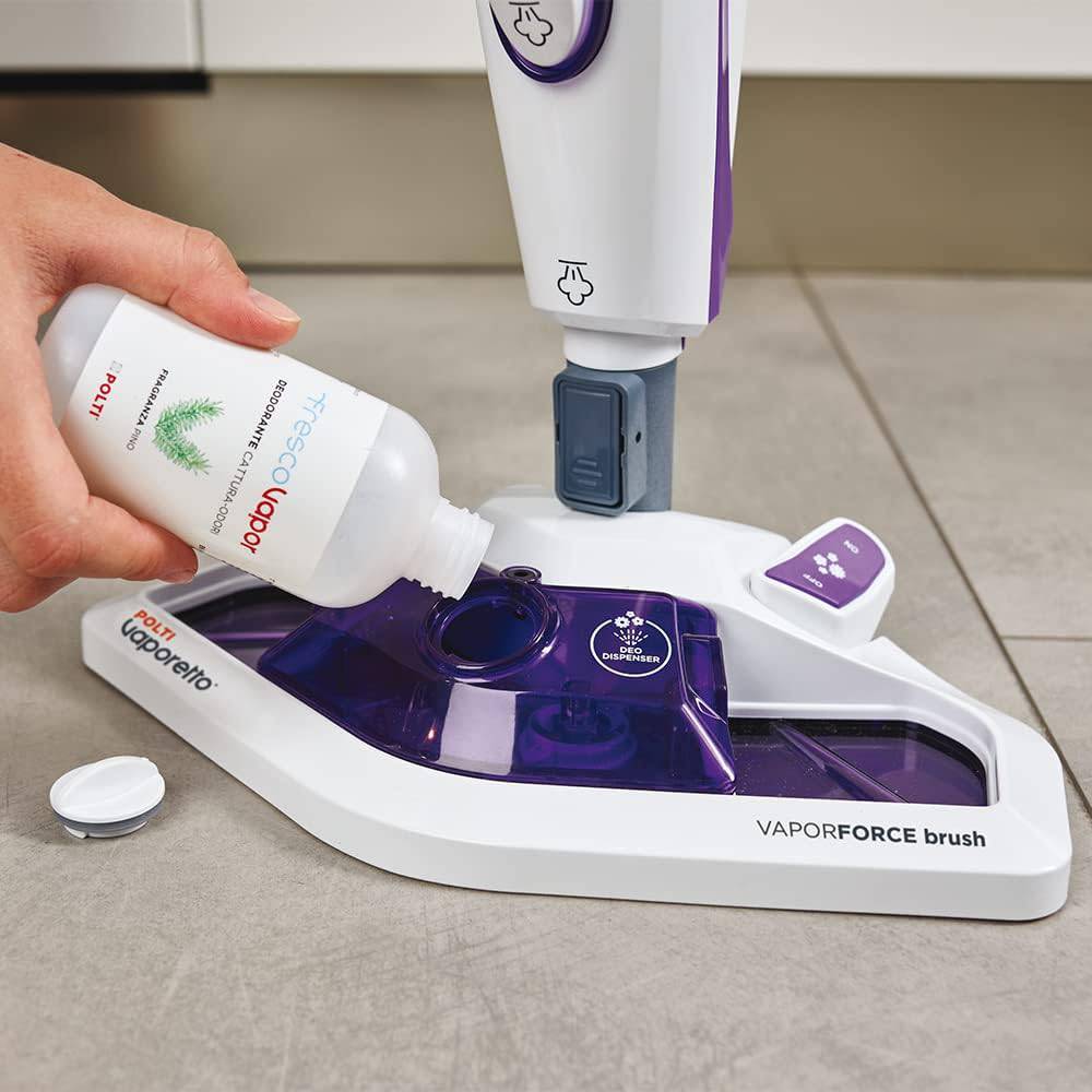 Grâce au distributeur Frescovapor dans la brosse, la vapeur est mélangée avec le désodorisant et parfume la maison.
